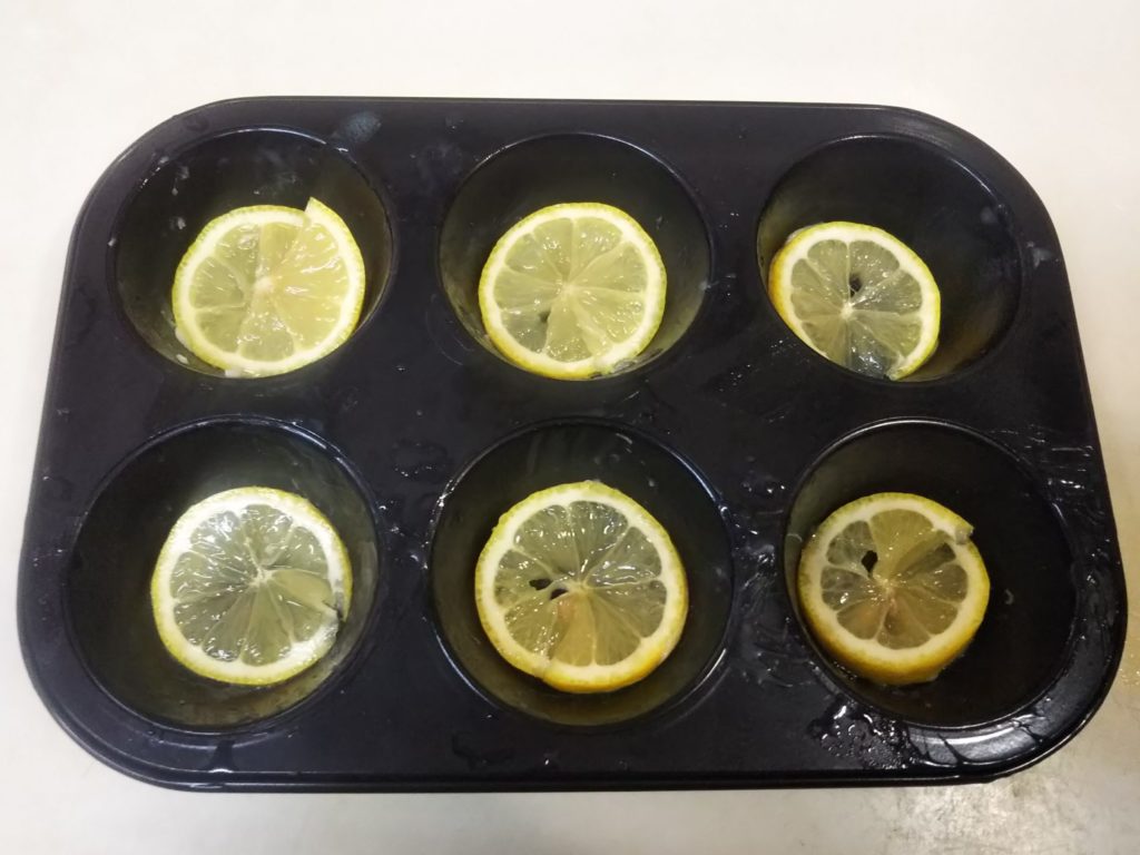 1. 型塗り用のバターを電子レンジで数秒加熱してやわらかくして、型に塗っておく。レモンは真ん中から6枚輪切りに切っておく