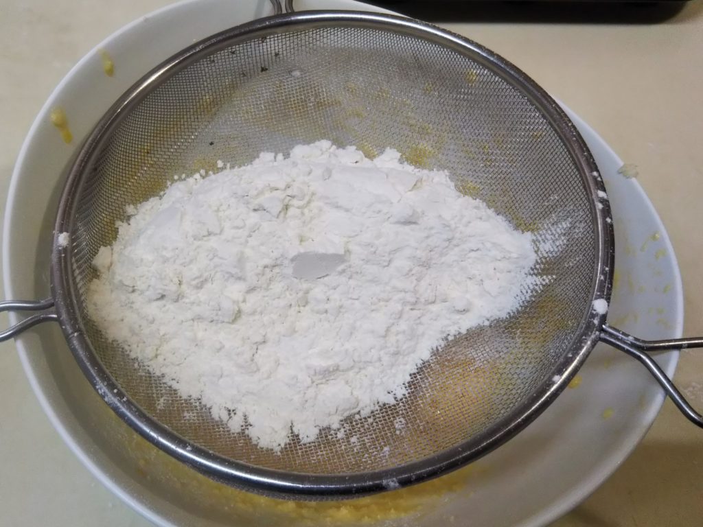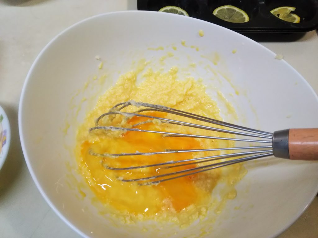 5. 小麦粉を篩い入れ粉っぽさがなくなるまでゴムベラで着るように混ぜる。残ったレモンの汁を絞り入れ、皮を摺り下ろして加える