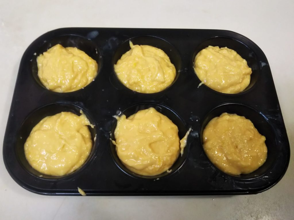 6. 生地をマフィン型に入れる。180℃に予熱したオーブンで25分から30分焼く