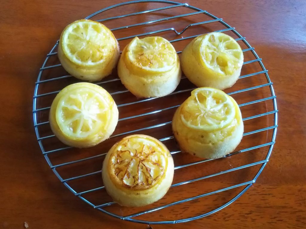 どうも、ここのところアップサイドダウンがマイブームのようです。以前Cottaさんのストレートマフィン型でオレンジのアップサイドダウンを作っている人を見かけましたが、うちには普通のマフィン型しかありません。なので、その時は、丸型で作ったのですが、オレンジは大きいけどレモンならちょうど入るんじゃないかな?なんて思い立ってレモンのアップサイドダウンを作ってみました。