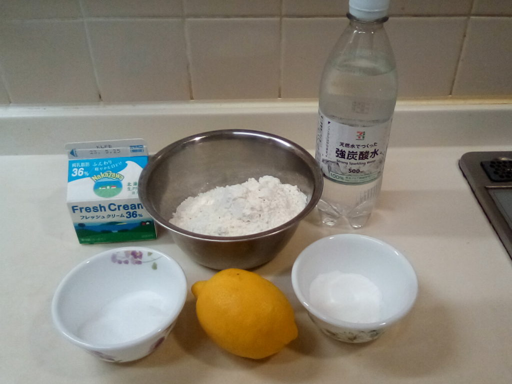 オーストラリアで食べられているスコーンだそうです。いくつかレシピを見てみましたが、スプライトのようなレモンと甘みの加わった出来合いの炭酸飲料を混ぜているケースがほとんどでした。それでもいいのかもしれませんが、ここでは砂糖、レモン、炭酸水と分けて加えてみました。