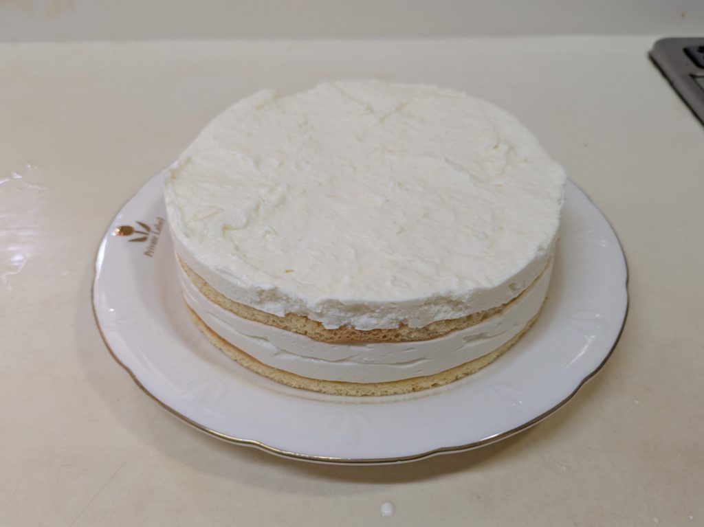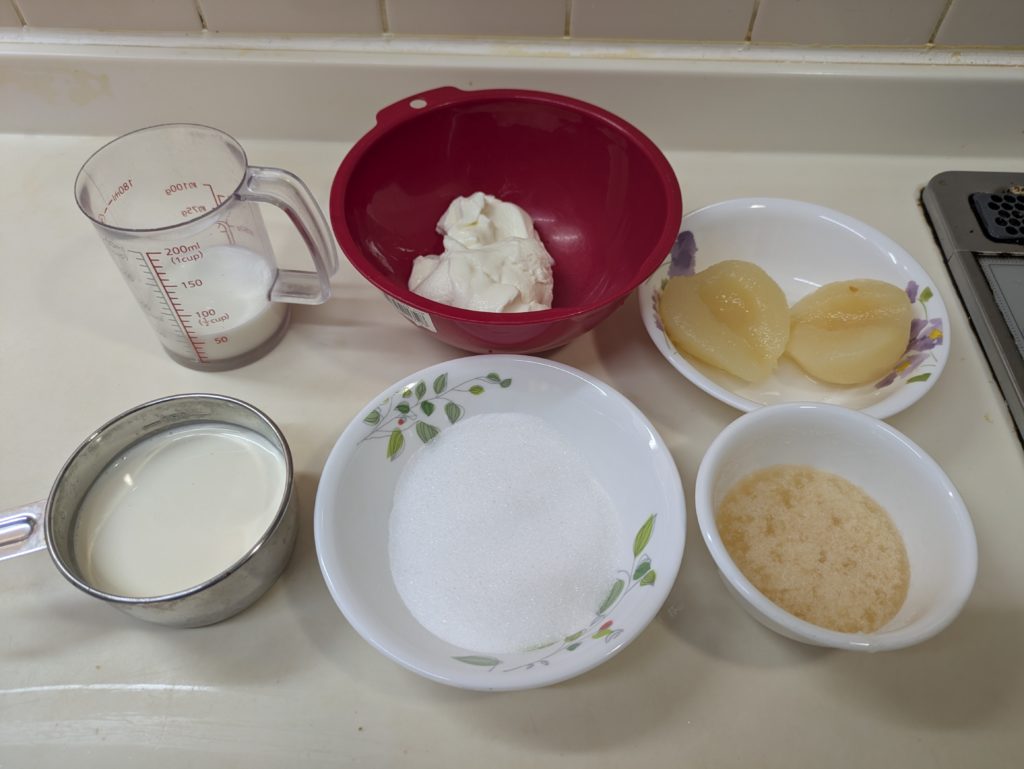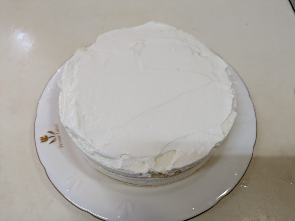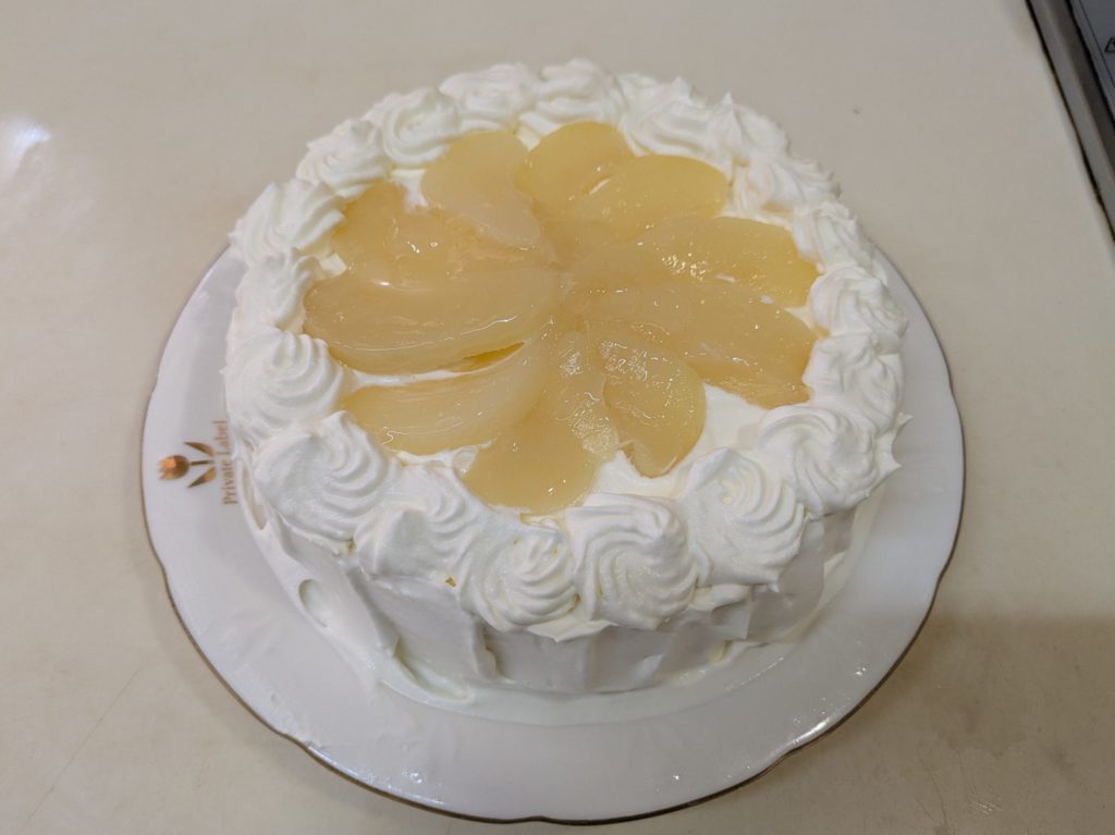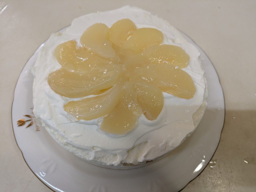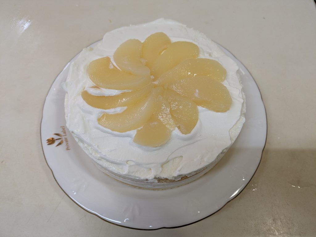 洋梨のヨーグルトムースとプレーンのヨーグルトムースを重ねたケーキを作りました。ムースとムースの間にビスキュイを挟んで、上には洋梨の缶詰を載せて周囲をホイップクリームで覆いました。ホイップクリームは簡単なようで案外難しいものだと再確認しました。