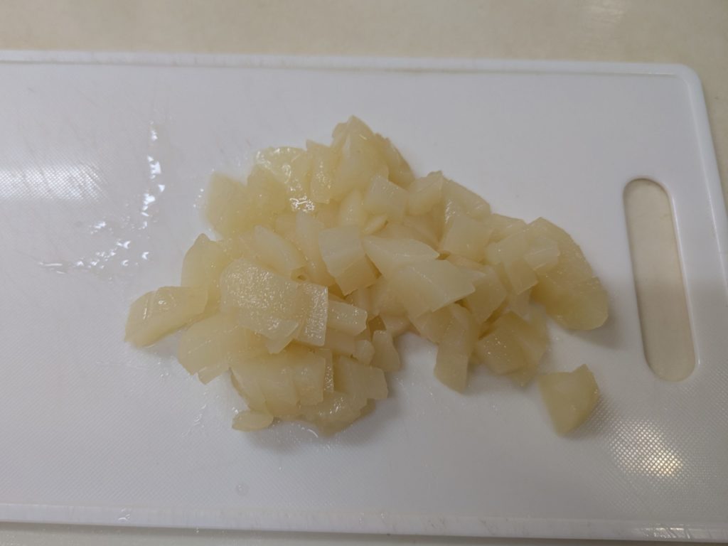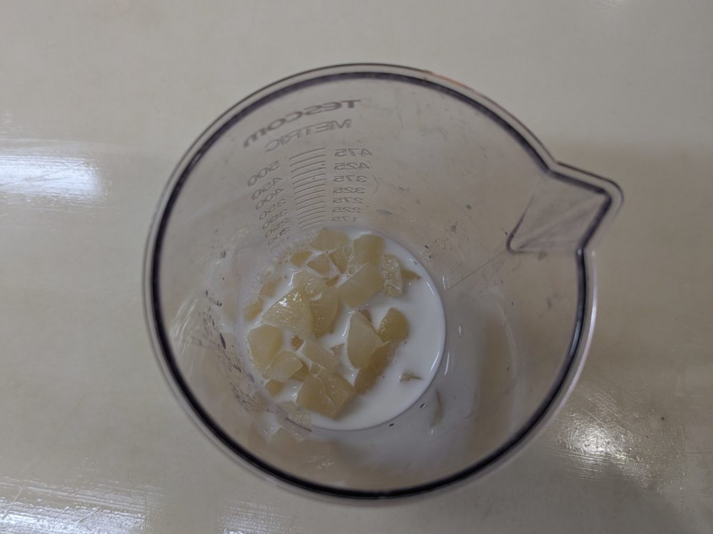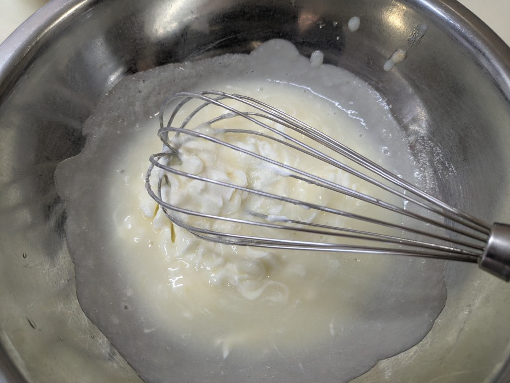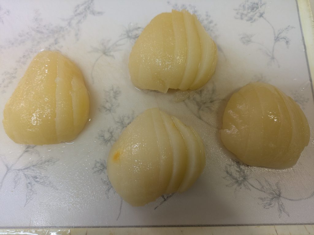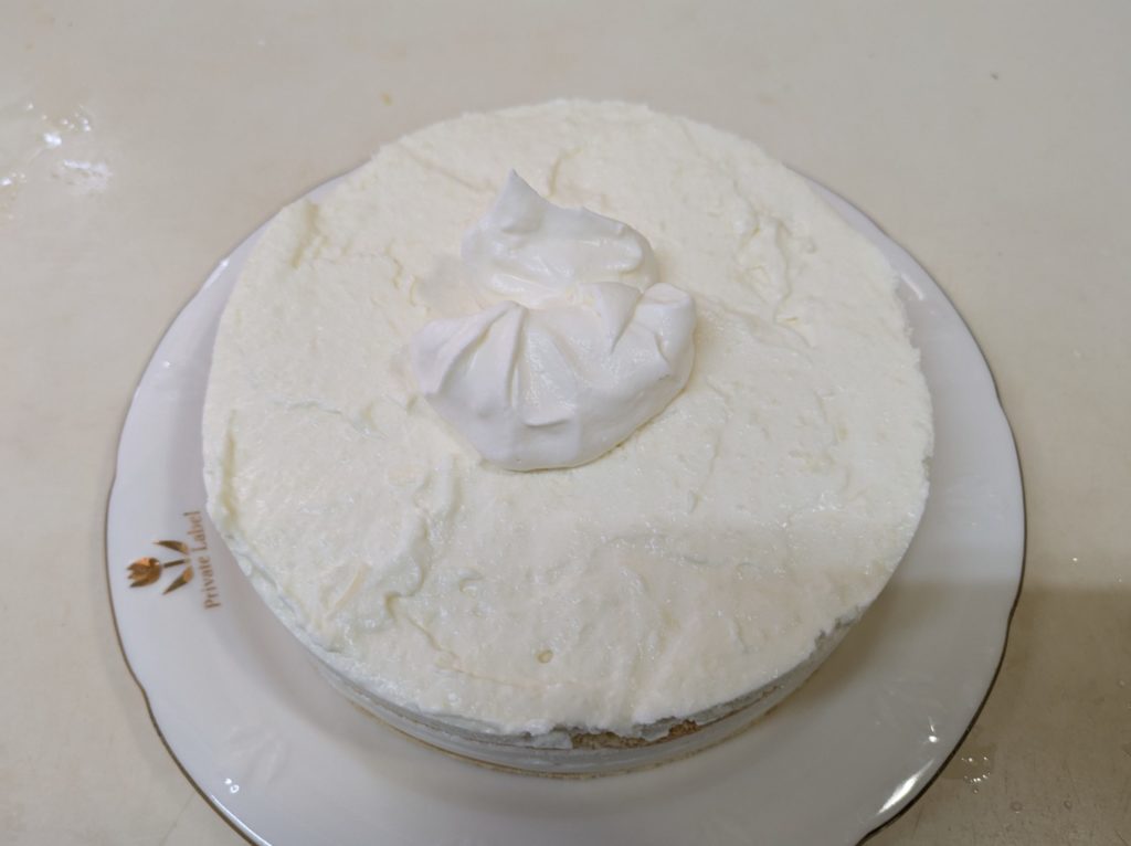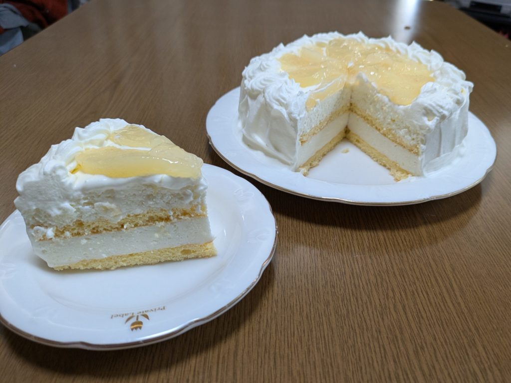 洋梨のヨーグルトムースとプレーンのヨーグルトムースを重ねたケーキを作りました。ムースとムースの間にビスキュイを挟んで、上には洋梨の缶詰を載せて周囲をホイップクリームで覆いました。ホイップクリームは簡単なようで案外難しいものだと再確認しました。