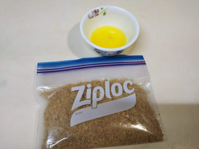 1. ビスケット(またはクラッカー)をジップロックに入れてすりこ木などで粉状になるまで叩く。バターは電子レンジで溶かす