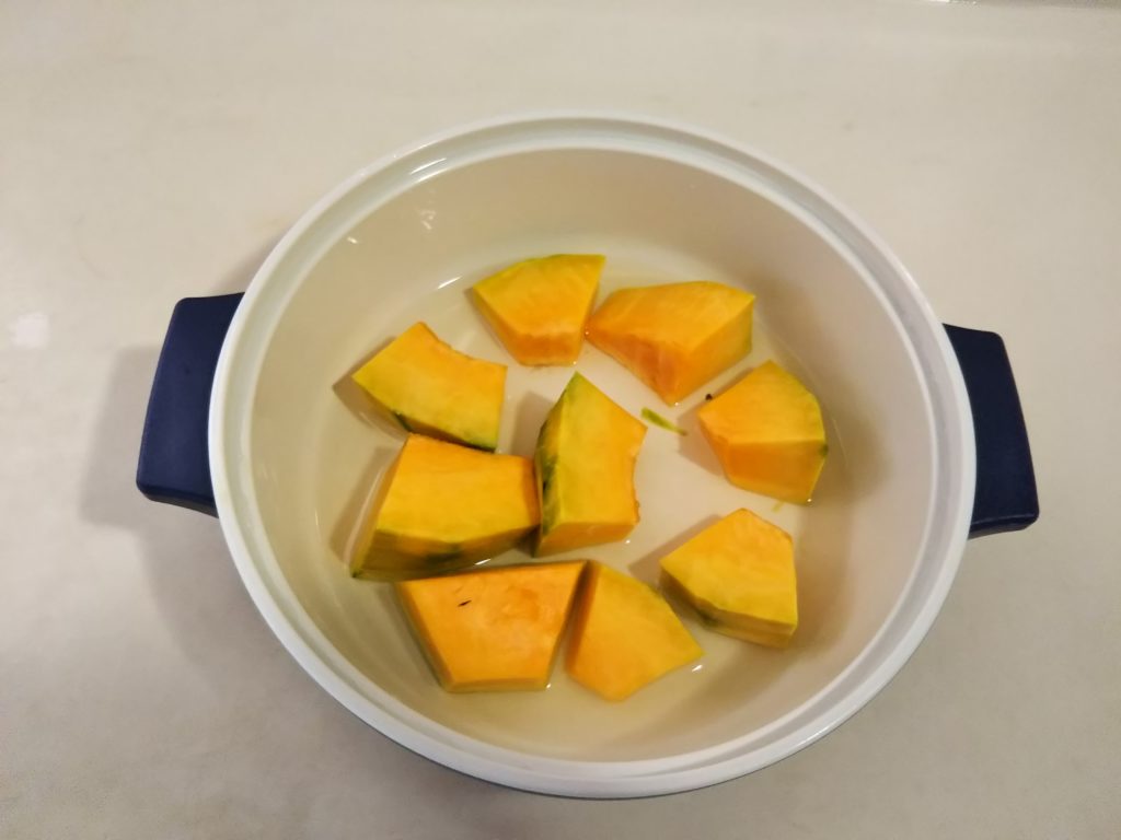 1. かぼちゃは皮を剥いていタネとワタを取り除き、適当な大きさに切って耐熱容器に入れて電子レンジで加熱する。熱いうちにマッシュしておく