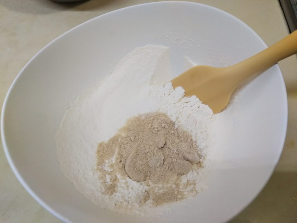 2. ボウルに小麦粉、ベーキングパウダー、砂糖、塩を入れてまんべんなく混ぜる