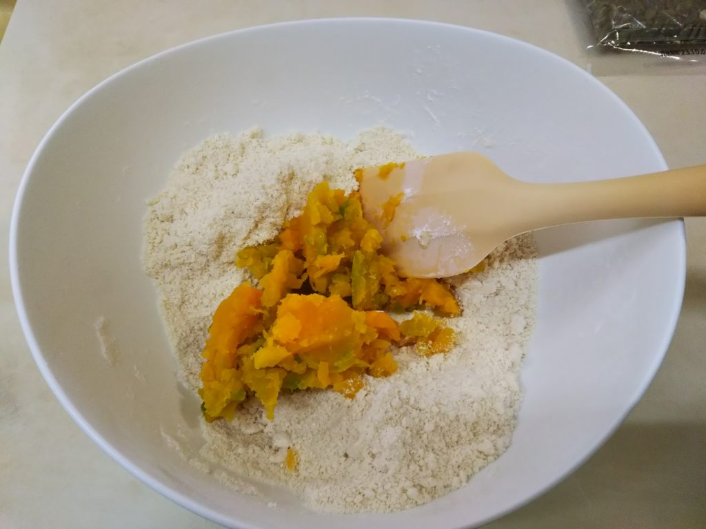 4. ピュレしたかぼちゃを加えて混ぜる