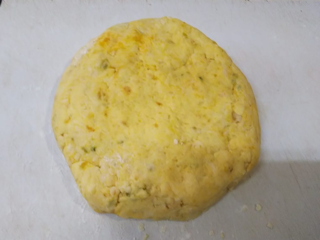 6. 手に強力粉をつけて、まな板の上で生地を円盤状にまとめる