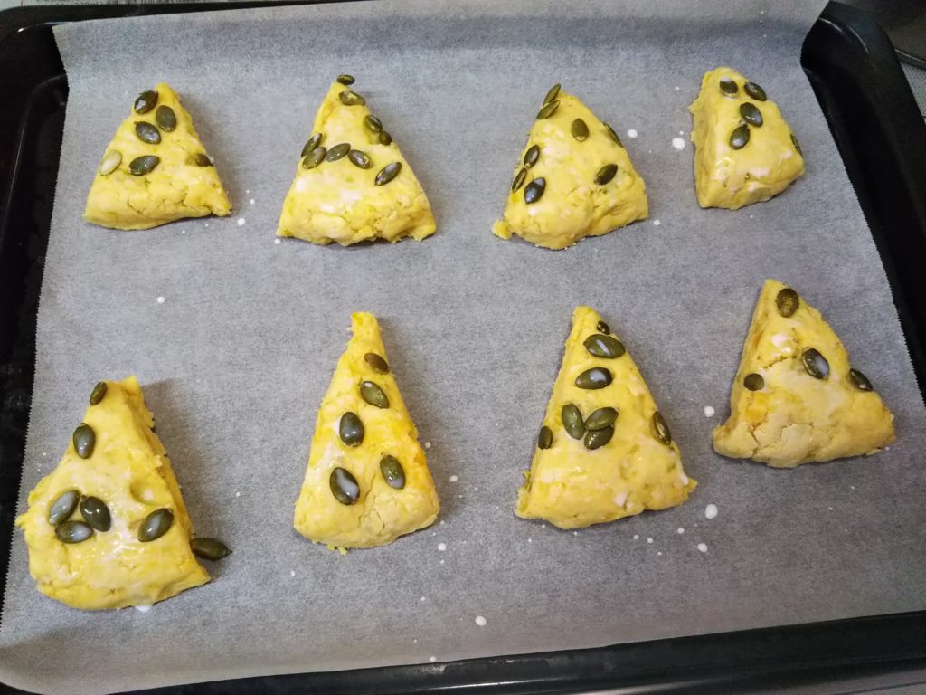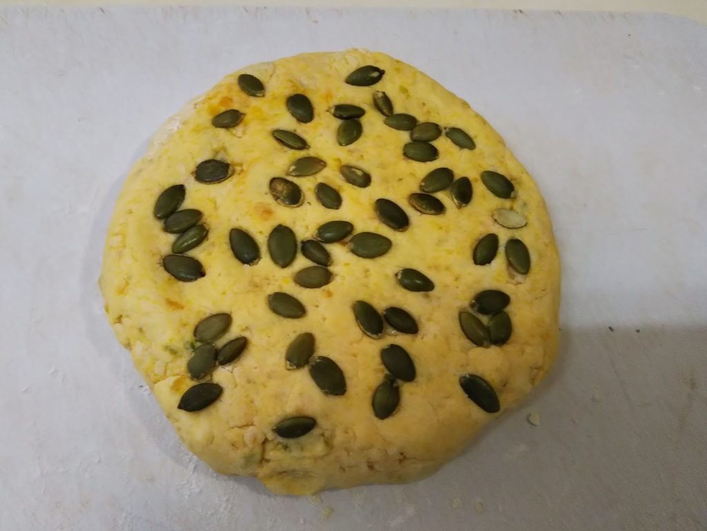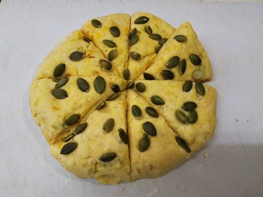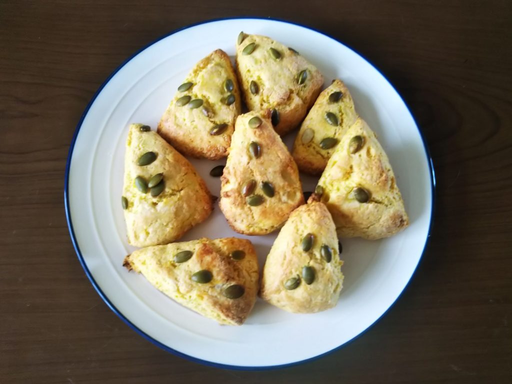 かぼちゃのピュレを入れてかぼちゃのタネを飾って焼いたスコーンです。かぼちゃが入っているので甘いかと思いましたが、思いのほか甘さを感じませんでした。