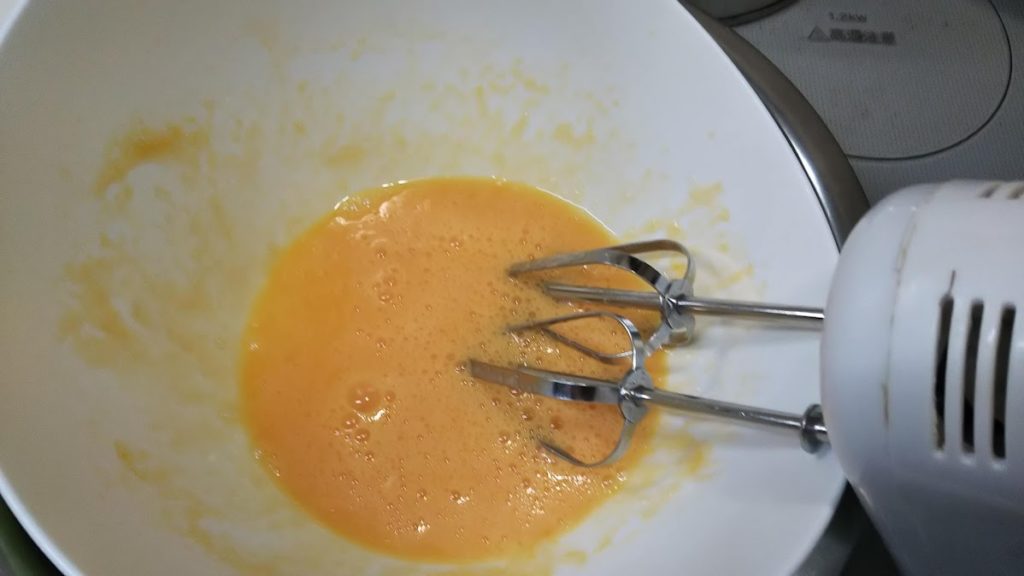 2. ボウルに卵と砂糖を入れて湯煎にかけながらハンドミキサー高速で攪拌する