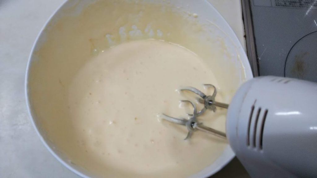 3. ハンドミキサーを持ち上げて生地がリボン状になったら、湯煎から外して低速で約1分攪拌する