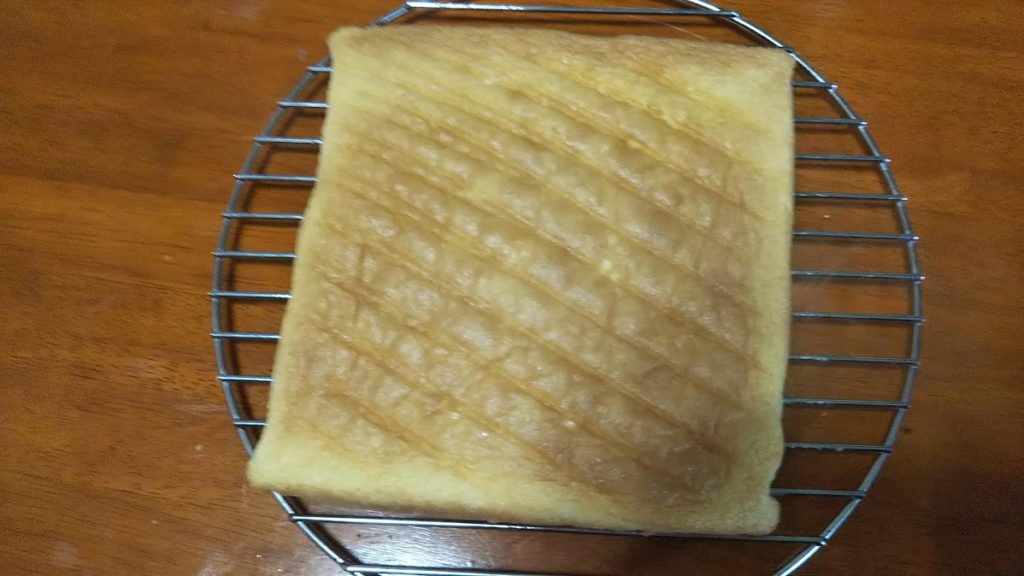 8. 焦げ目のあるほうを上にして、中身がケーキクーラーのラインと平行になるように置いて休ませる