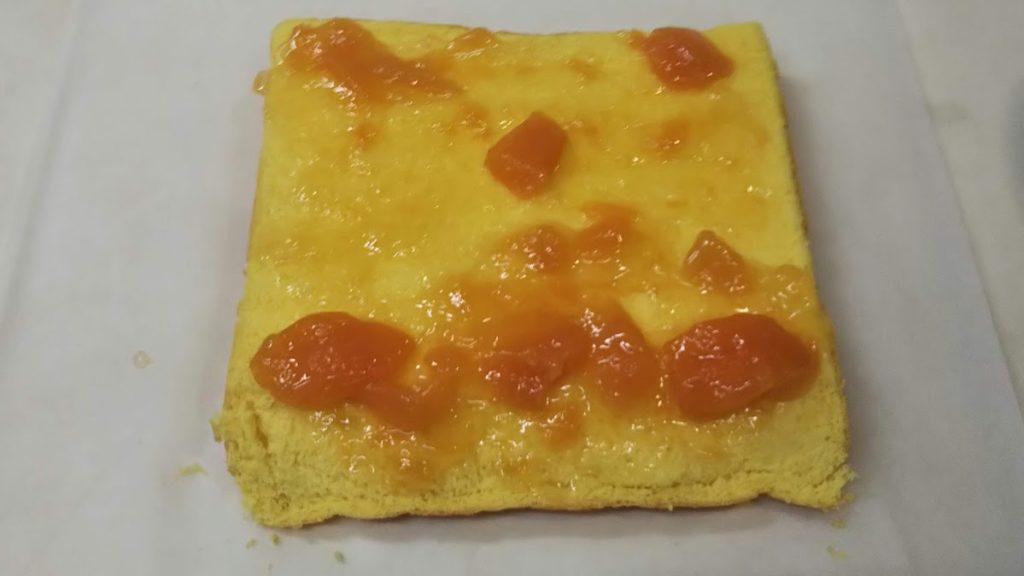 1. 焼き上げて冷ました状態。今回はアプリコットジャムを塗りました