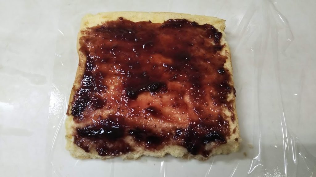 9 巻きはじめの部分を斜めにカットして、ラズベリージャムを全体に塗る