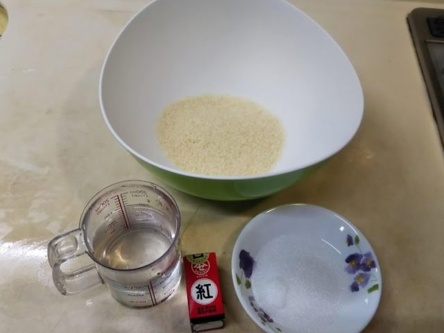 桃の節句…といえば桜餅ですね。桜餅は白玉粉を焼いたクレープ状のもので餡子を包む東の長命寺スタイルと、道明寺粉を蒸かして作る西の道明寺スタイルがあります。ここ数年、電子レンジで簡単に作れる事を知ったので道明寺スタイルを作っています。レシピはDelish Kitchen のレンジ簡単!桜餅(関西風)を参考にさせていただきました。今回はピンクに着色したオーソドックスなものと、染めないで桜の花を貼ったものと2種類作ってみました。