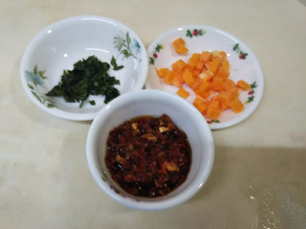 1. ドライトマトがふやけたら水気を絞っておく。バジルは細かく切る(ドライスパイスを使う場合はそのまま使う)