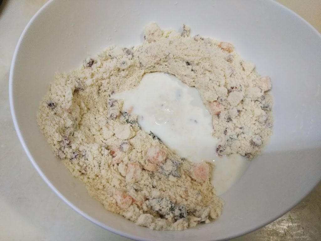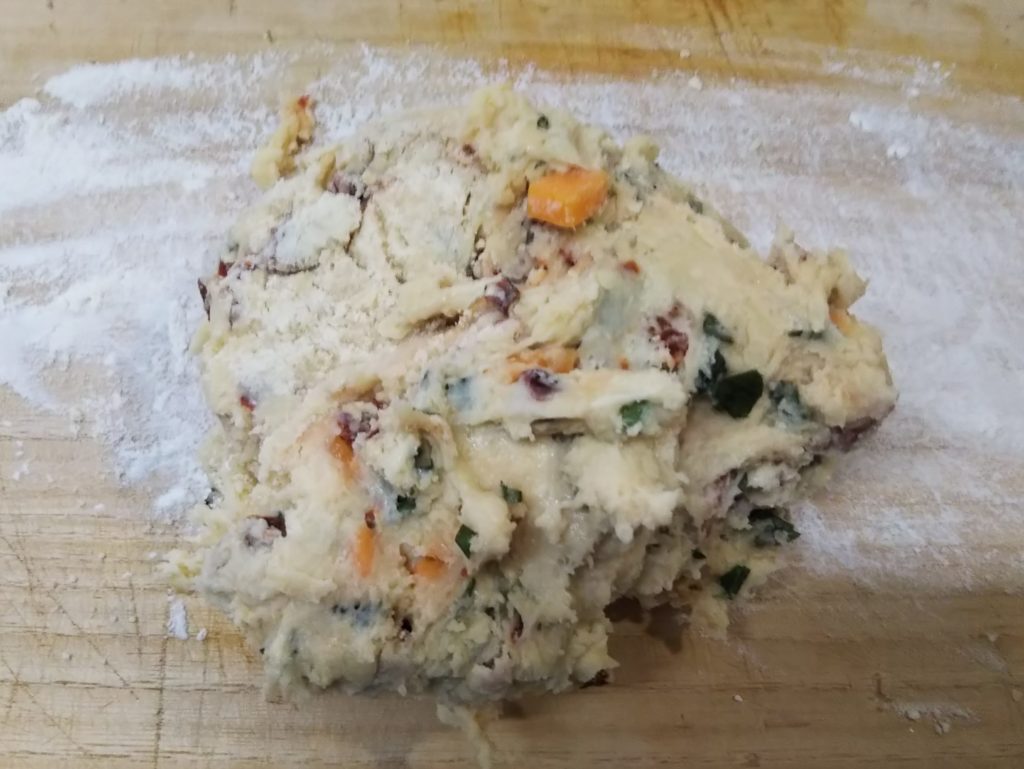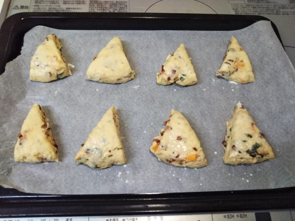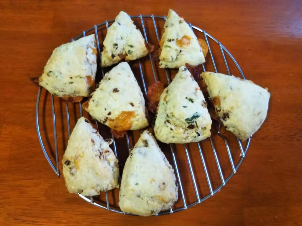 アメリカ風スコーンにドライトマトとバジルを入れて焼いてみました。チェダーチーズも加えて、ボリュームのあるおかずスコーンになりました。