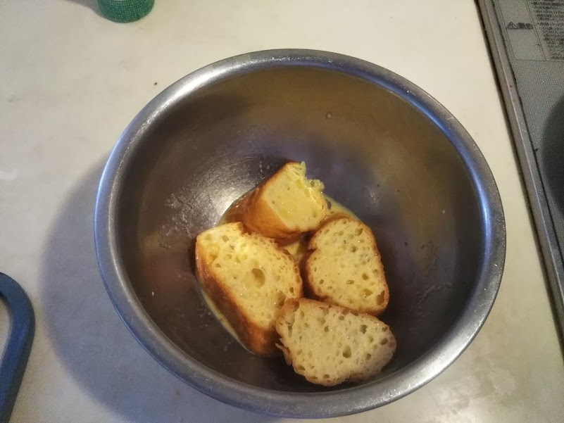 1. ボウルに卵、牛乳、砂糖を入れて混ぜ合わせ、切ったフランスパンを漬けておく