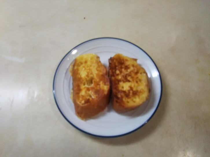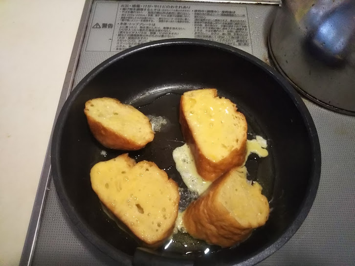 2. フライパンに油を敷き、卵汁に漬けたパンを両面焼く