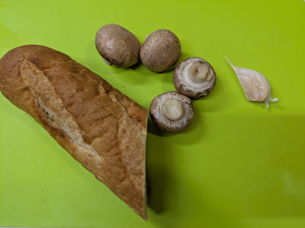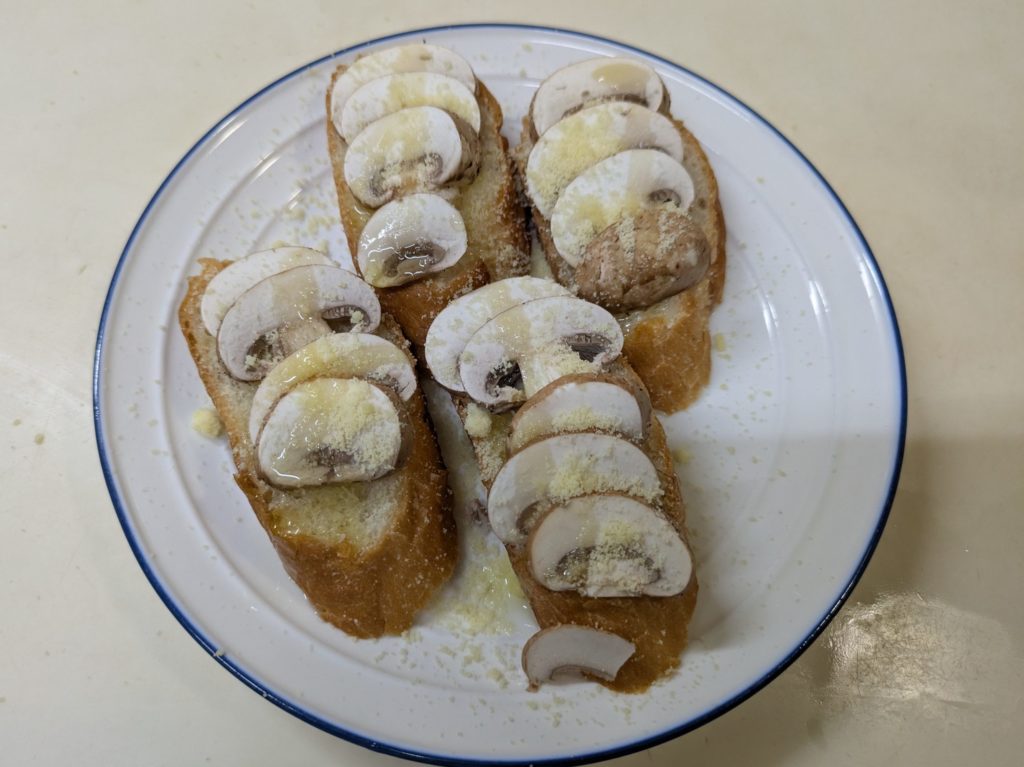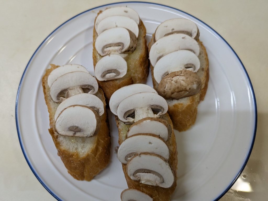 とうもろこしスープと同様、こちらも4人分、一人一品で設定されていますが、一人2品は全然いけてしまいます。お手本ではバゲットを細長く切るため、一切れのバゲットにマッシュルーム1個分が乗りますが、中途半場なバゲットから4切れ作ったので、マッシュルームは3個で足りてしまいました。お手本ではオーブンで焼きましたが、オーブントースターでも問題なくできました。
