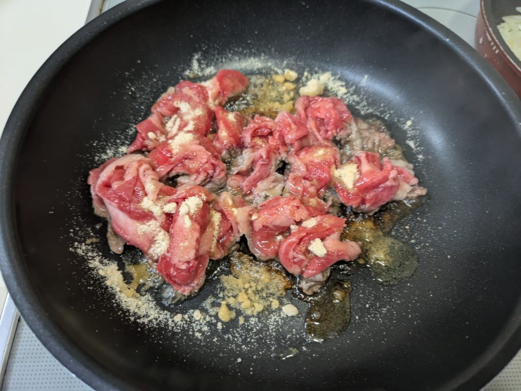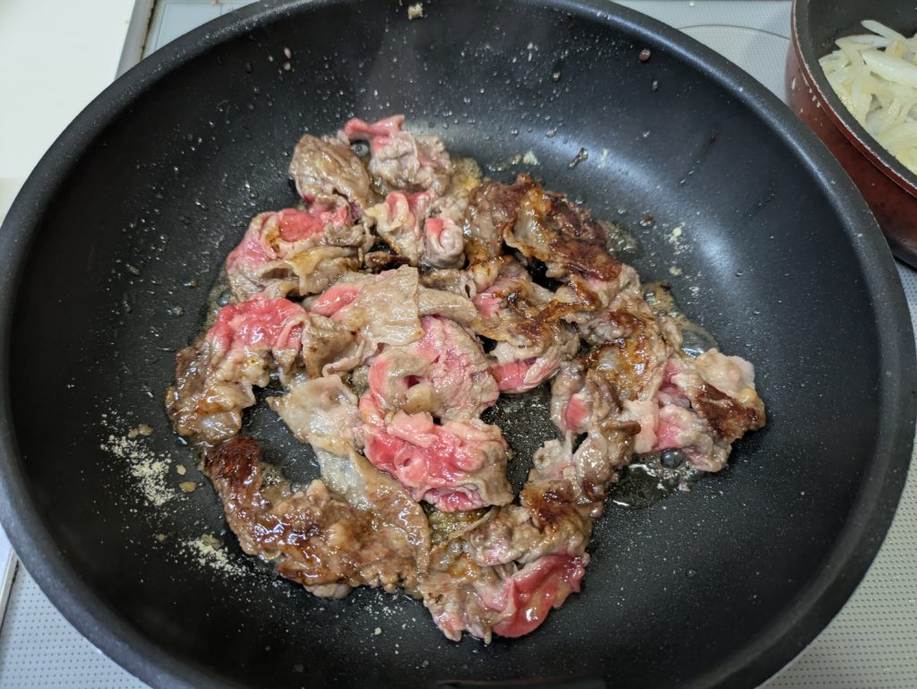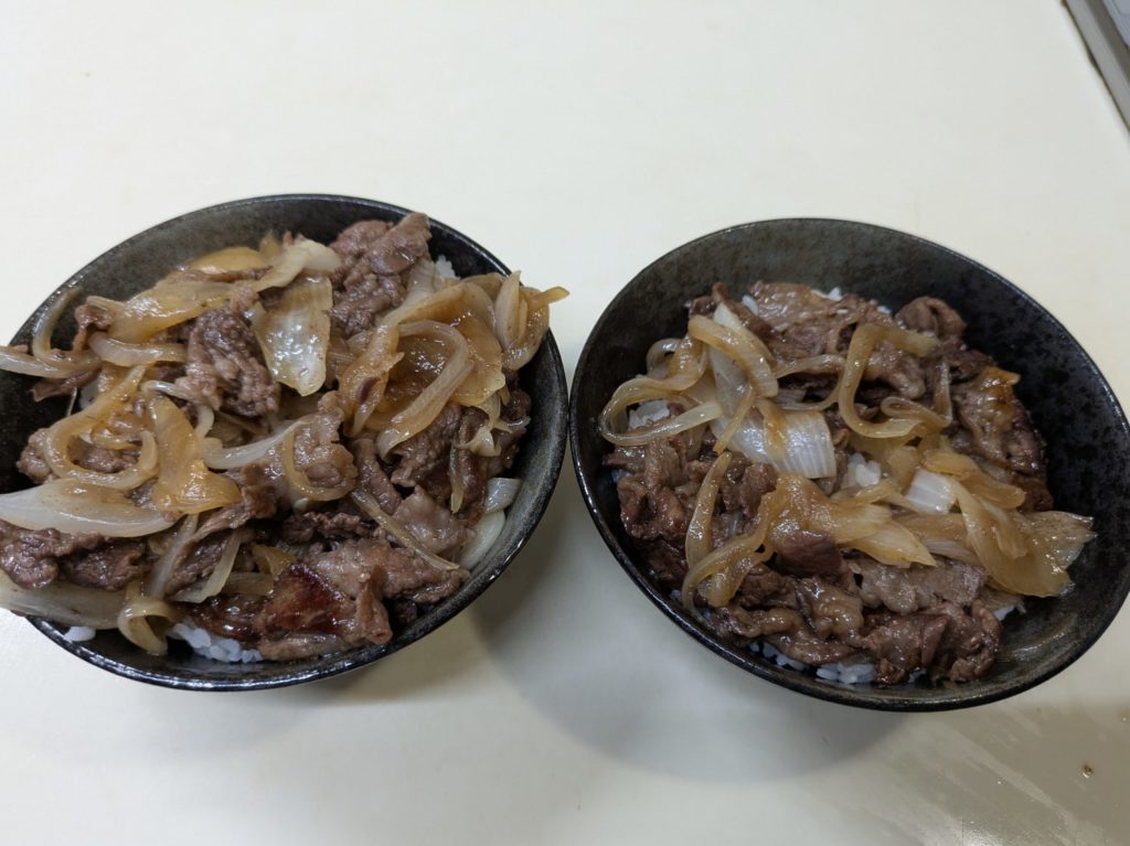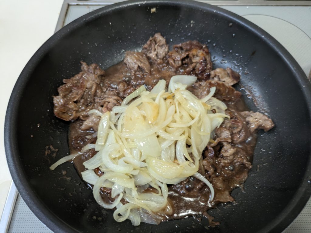 ミッドナイト屋台2からフレンチ風牛丼です。フランスの三ツ星レストランで接客の最高責任者、メートル・ド・テルを努めた御崎の注文で短い時間で作る煮込み料理、翔太が考え抜いて作ったのがフレンチのテイストを取り入れた牛丼でした。赤ワインで煮込むので普通の牛丼よりも肉のくさみを感じず、簡易ブフ・ブルギニヨンのようでした。元のレシピでは三温糖を使いますが、私はきび砂糖を使用しました。また、一味唐辛子も七味唐辛子で代用しました。