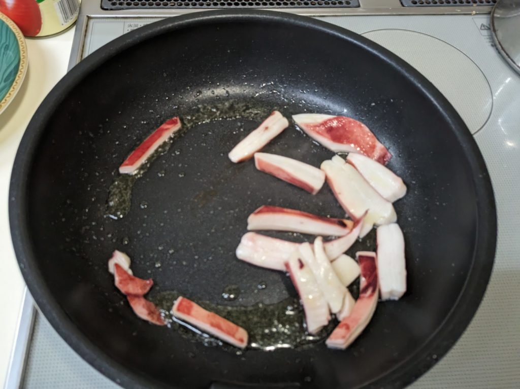 3. フライパンに油を敷いて熱し、イカを炒めて火が通ったら皿に除ける