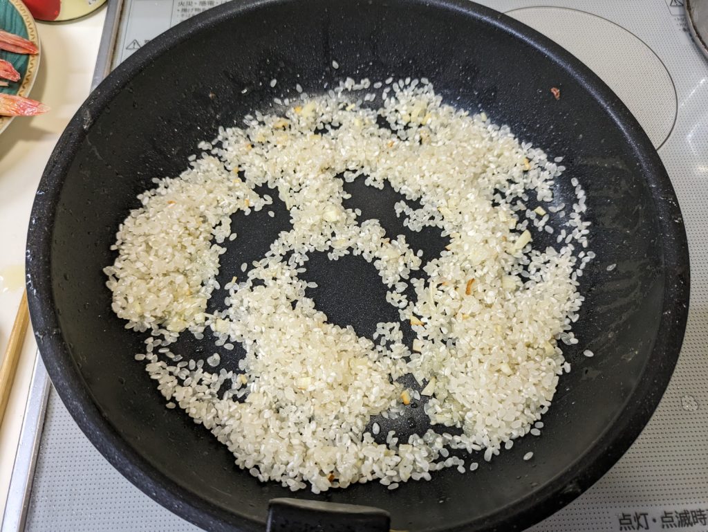 7. ニンニクが香り立ったら米を追加して透き通りまで炒める