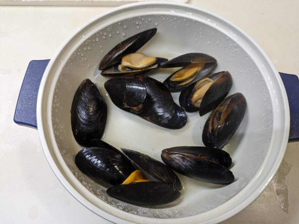 2. 耐熱容器にムール貝を入れ、蓋をして電子レンジ500Wで約3分加熱する