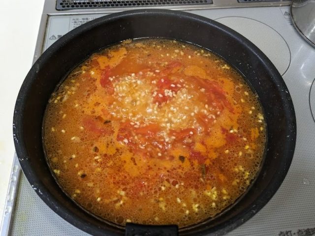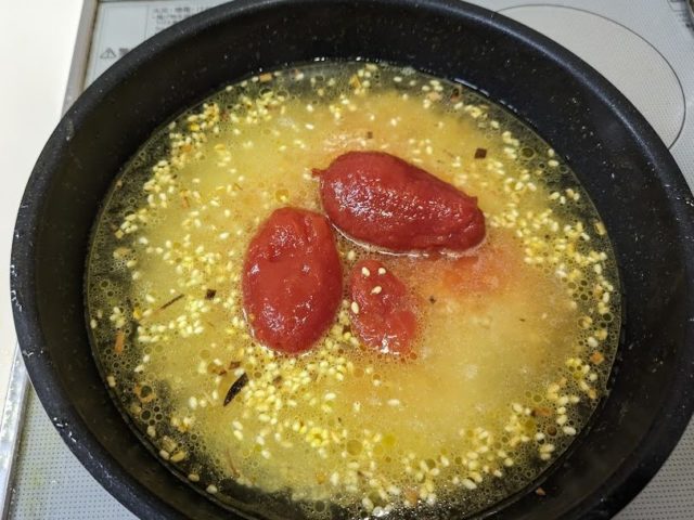 8. 水、ブイヨン、トマト、ターメリックを加えて強火にかける