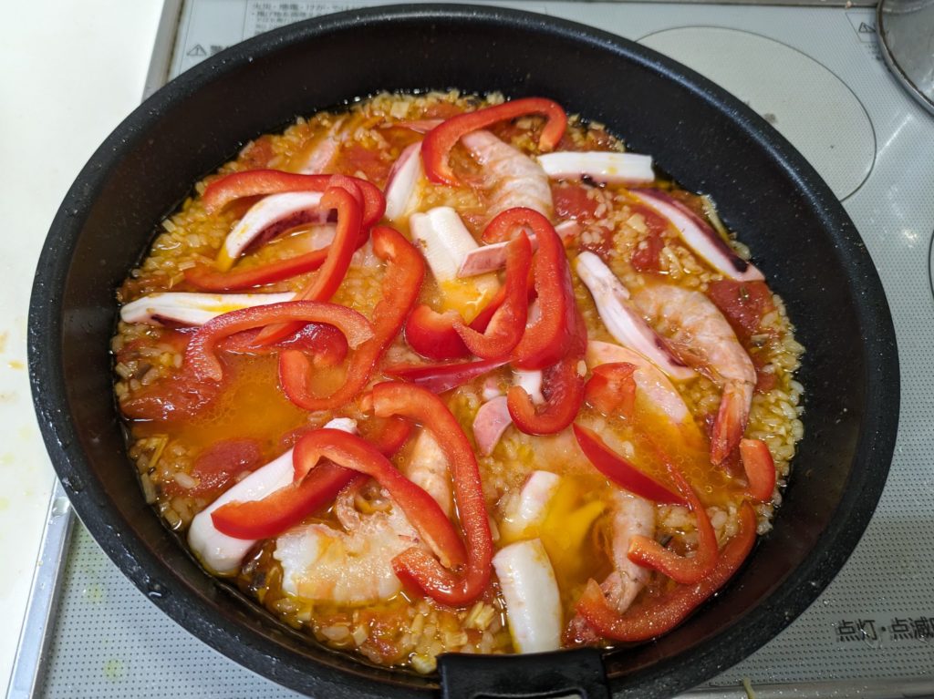 10. 海老、イカ、パプリカを加え、蓋をして中火~弱火で約5分煮る
