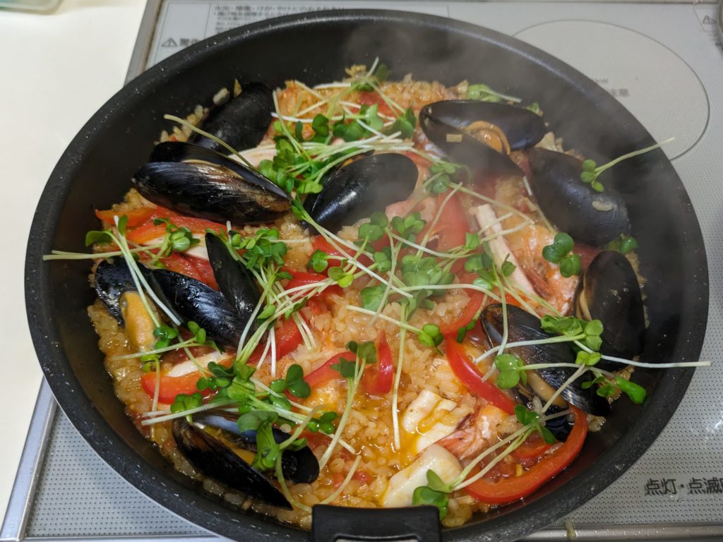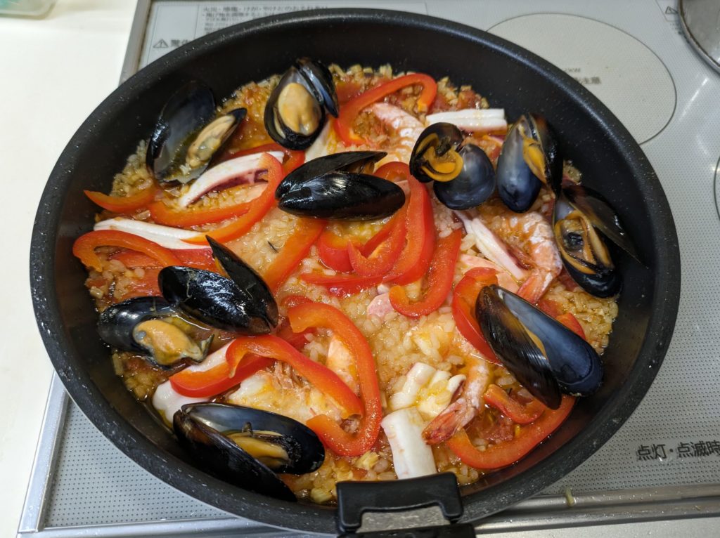 ムール貝があったので、魚介のパエリアを作りました。シーフードの定番はムール貝、海老、イカ、タコだそうです。海老は殻付きのものを、イカはできれば1杯そのまま使いたいのですが、売っていなかったので茹でてあるイカを買ってきました。