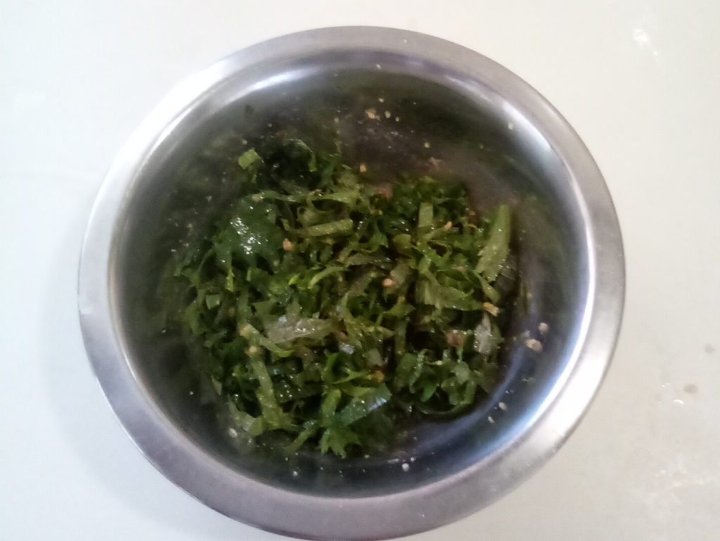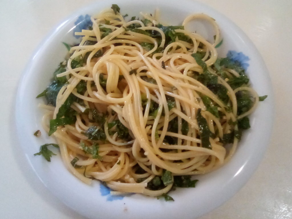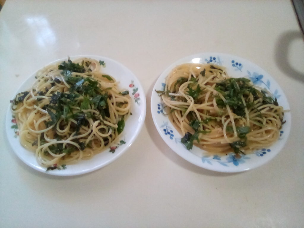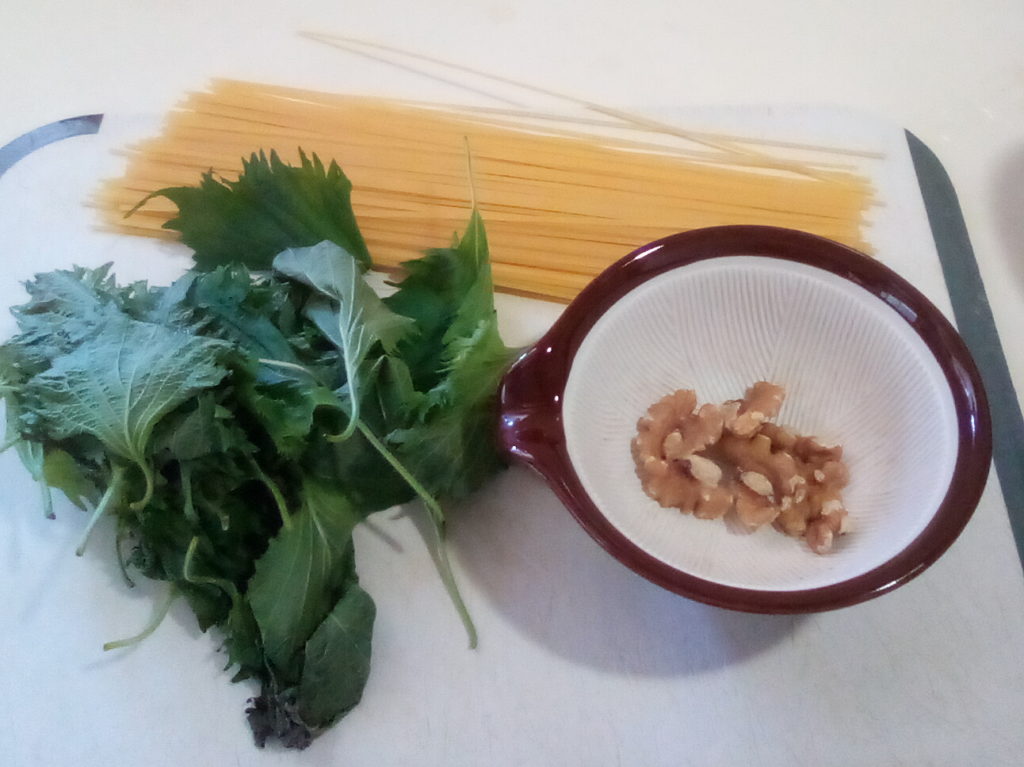 大葉を使った和風のスパゲティです。本当はジェノヴェーゼを作ろうかと思ったのですが、ミルが壊れていたのでこんな形にしちゃいました。これはこれでシンプルで悪くないです。通常は2人分作りますが、今回は麺が1人分しかなかったので、1人分を半分に分けて他のものと合わせて食べました。