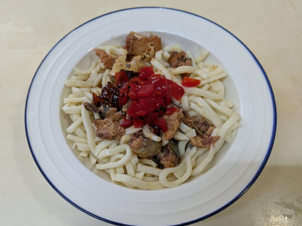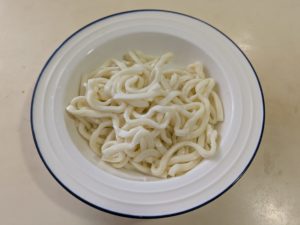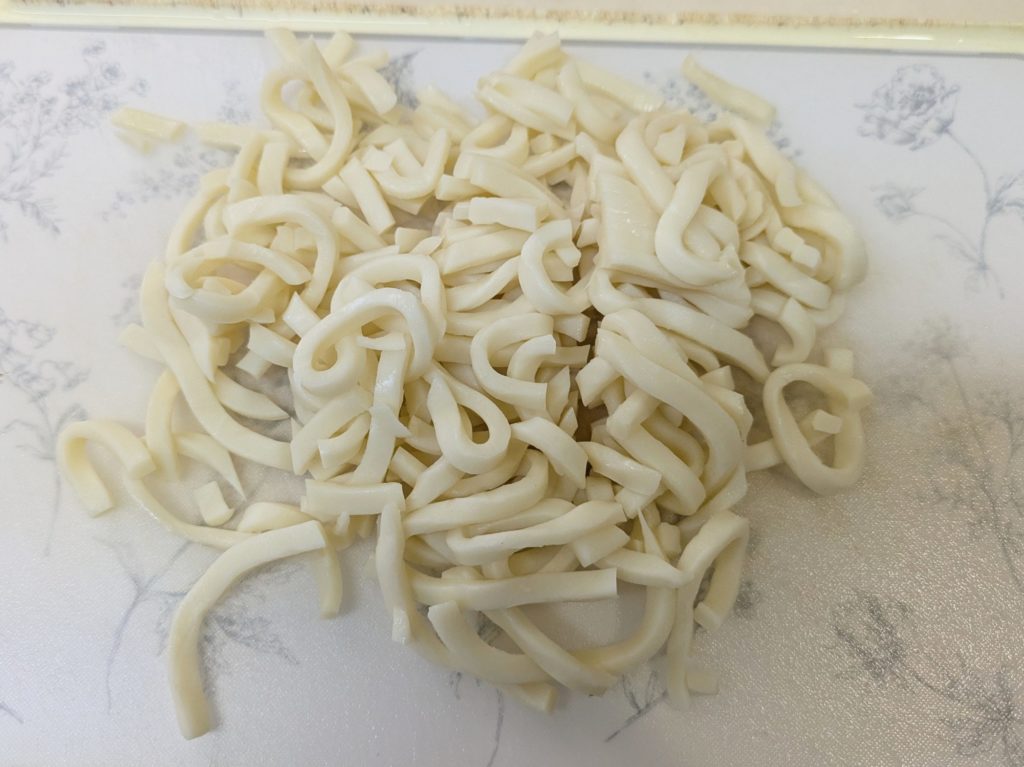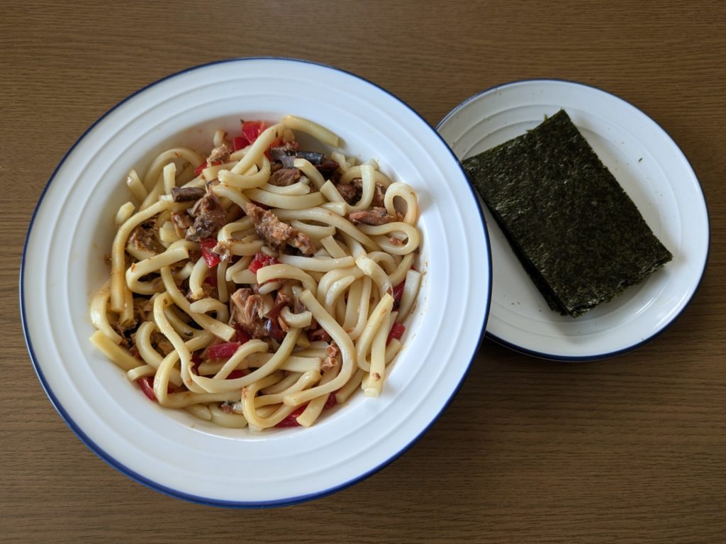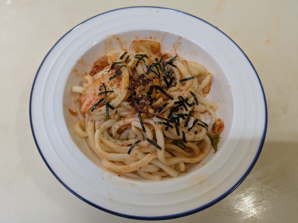 今回作ってみた3つのメニューのうち、これが一番食べやすく美味しかったと思います。キムチですからもちろん辛いのですが、塩味はそれほど感じなかったし、他の二品と比べてうどんに馴染むような気がしました。まあ、人それぞれの好みもあるでしょうが。