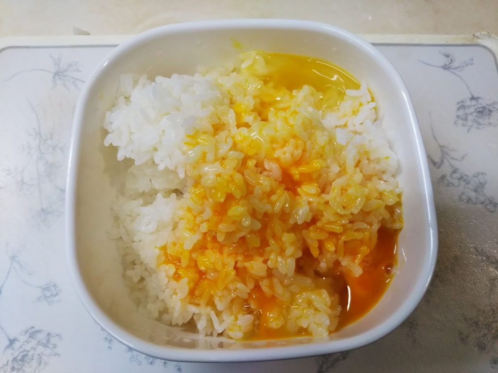2. ご飯は電子レンジで加熱して、溶き卵を絡ませる