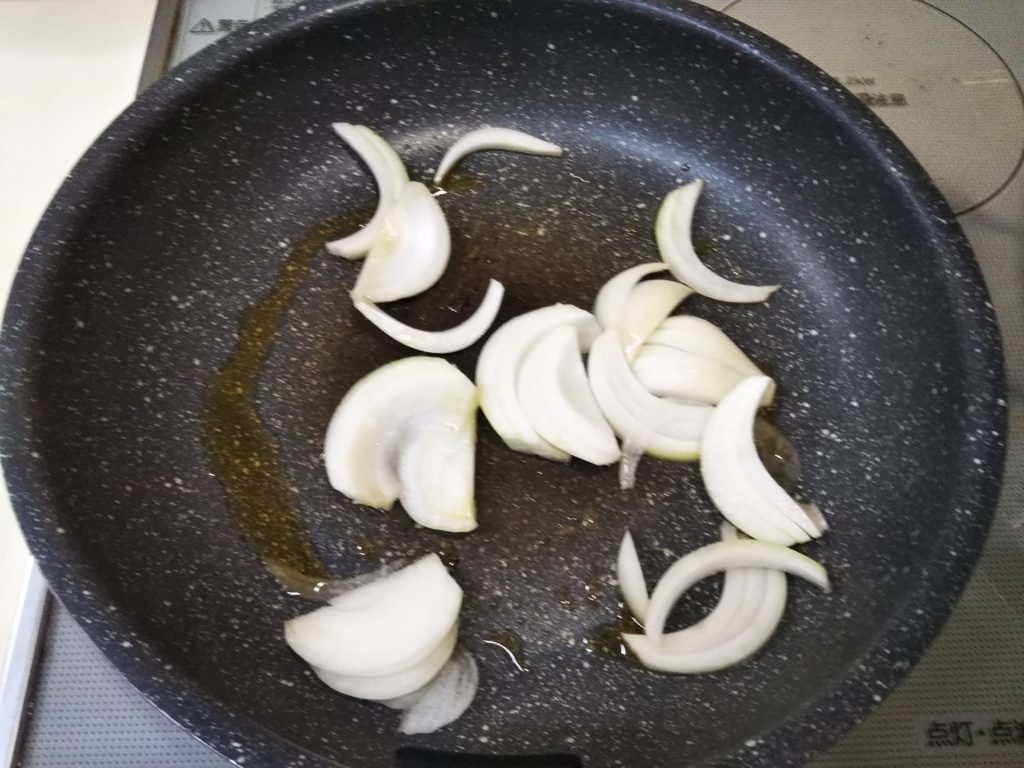 5. フライパンに油を熱し、玉葱を炒める