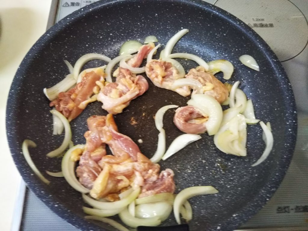 6. 玉葱がしんなりしたら、1.の鶏肉を加えて炒める