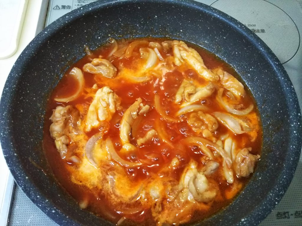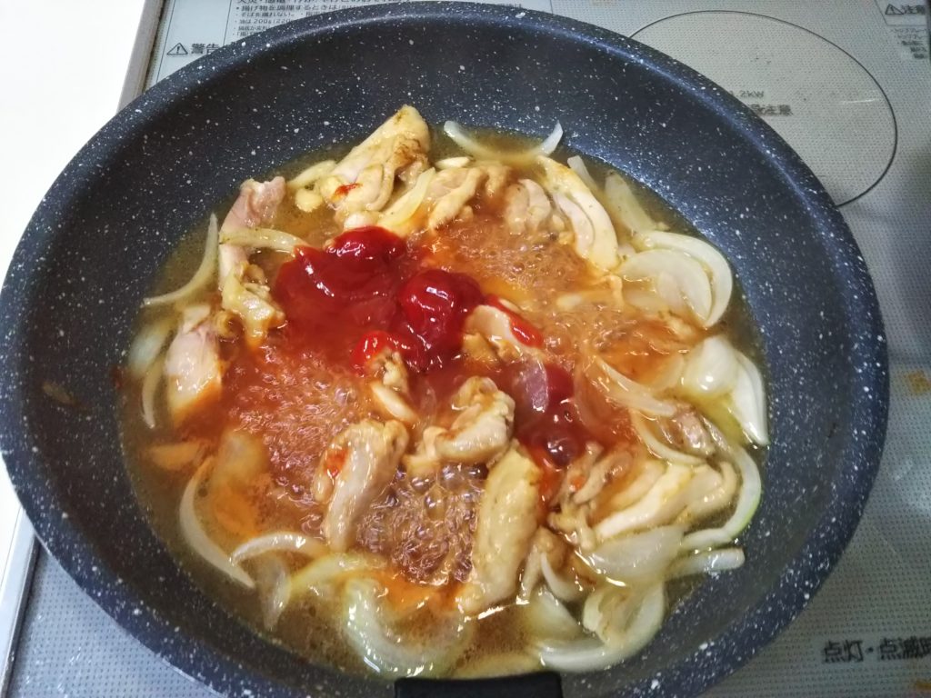 7. 鶏肉に火が通ったら、水、砂糖、トマトピューレを入れて軽く煮込む