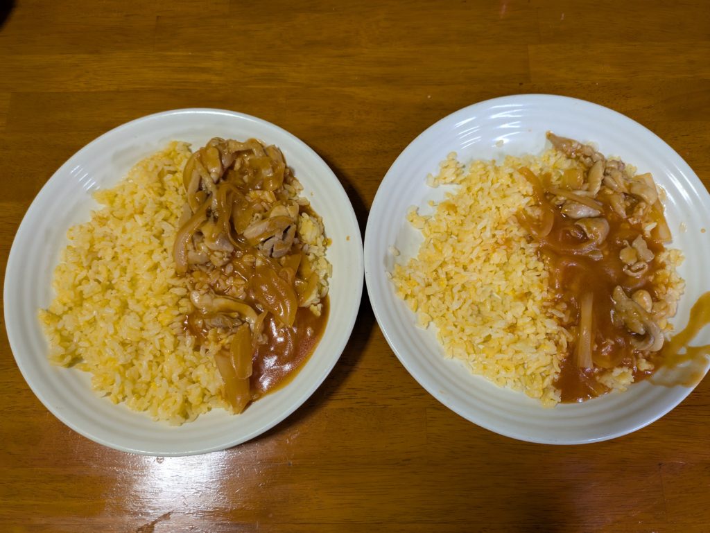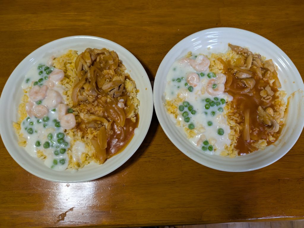 香港やマカオで食べられている二色のあんかけチャーハンを作ってみました。トマトケチャップで味付けした赤いソースと牛乳ベース(レシピによるとコンデンスミルクを使っているものもあります)の白いソースをかけた見た目も楽しい炒飯です。本来太極のように分かれ目をカーブさせるそうなのですが、普通に半々で作ってもいいでしょう。