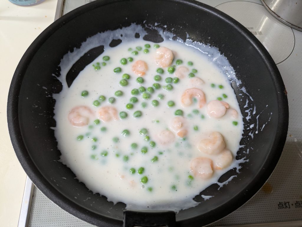 10. フライパンに油を熱し、海老とグリーンピースを炒める